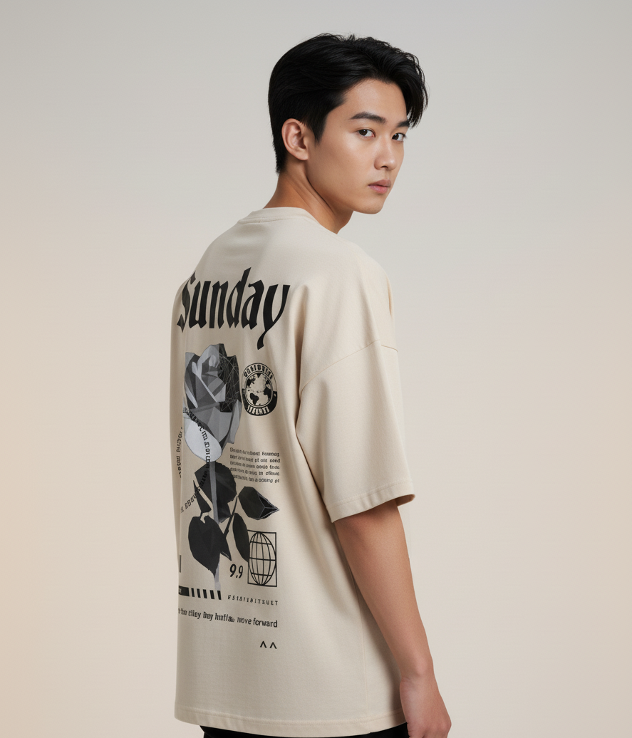 Beige oversized streetwear T-shirt with Golden Clasp front print and a bold Sunday Rose graphic on the back. Comfortable, stylish, and perfect for everyday wear.